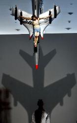 Un hombre mira la figura del Cristo crucificado sobre un avión de combate estadounidense, una de las obras del argentino León Ferrari que han sido calificadas de "blasfemas".
