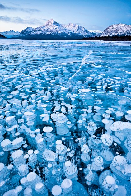 de burbujas atrapadas bajo la superficie de un lago congelado en Canadá.