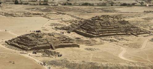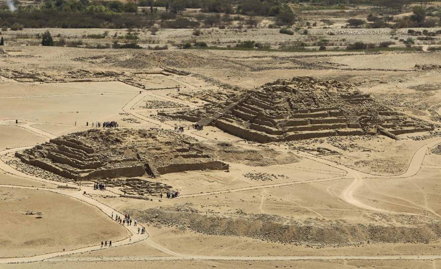 Panorámica de las pirámides de Caral, en medio del desierto,
