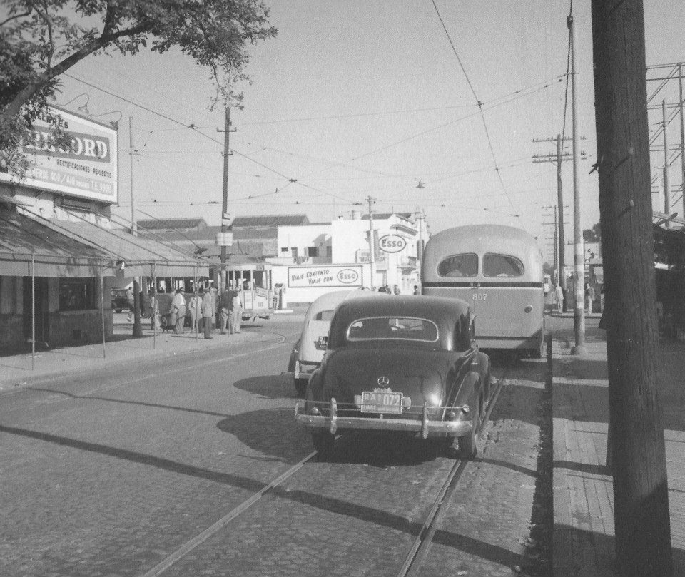 1958. La esquina de Cafferata y Córdoba vista por esta hacia al oeste. Un tranvía a punto de doblar la ochava del bar (que aún existe) en dirección al centro.