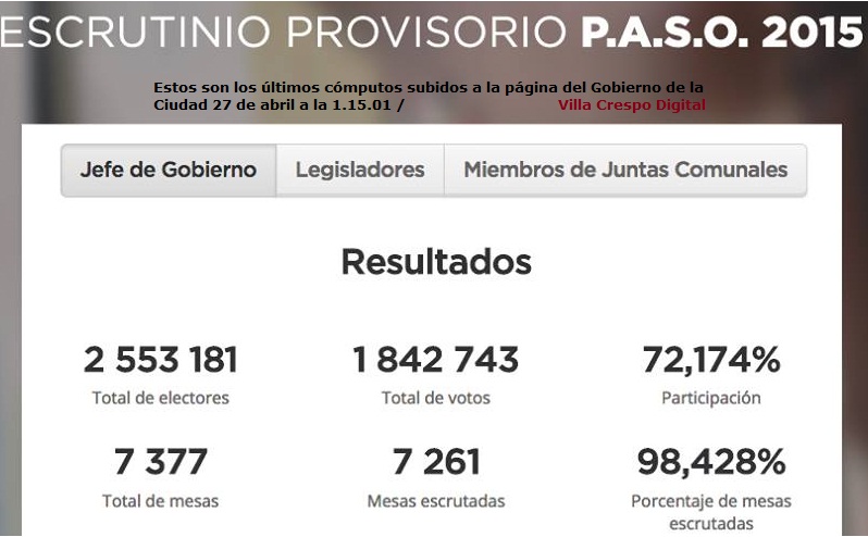 | POLÍTICA / RESULTADOS PROVISORIOS DE LAS PASO 2015 Por Elena Luz González Bazán especial para Villa Crespo Digital 28 de abril del 2015 En las elecciones P.A.S.O / primarias abiertas simultáneas y obligatorias se presentaron 30 precandidatos por distintos partidos y alianzas para ser candidatos a jefe de gobierno de la Ciudad de Buenos Aires, de este pelotón de aspirantes, sólo cinco serán los protagonistas el próximo 5 de julio. Indudablemente, el candidato que más ha sorprendido, que no tuvo ni tiene recursos para una campaña onerosa y hasta hartarte y que llegó a la saturación como fue estas PASO y que seguramente seguirá siendo así en los próximos meses, fue la nominación de Luis Fernando Zamora por Autodeterminación y Libertad. En esta entrega, la próxima será los resultados Comuna por Comuna, muestra, por un lado, que algo más del 72 por ciento fue a votar, de ese total apenas un 2 por ciento son en blanco, nulos, impugnados o recurridos. Que las encuestadoras mostraron que salvo el primer lugar y la certeza de que ganaba la fuerza oficialista, el resto de sus análisis no fueron muy acertados. ELECCIONES EN LA LEGISLATURA En este caso se presentaron 16 alianzas o partidos y 6 serán las que competirán para un lugar entre las bancas que se renuevan: 30 sobre 60 en total. PRO, ECO, Frente para la Victoria, Frente de Izquierda y los Trabajadores, Autodeterminación y Libertad y Camino Popular, en el último caso es importante destacar que evidentemente hubo corte de boleta que favoreció a los Legisladores y fue en contra de su candidato a Jefe de gobierno: Claudio Lozano, quien no llegó a 1,5 por ciento. Con
