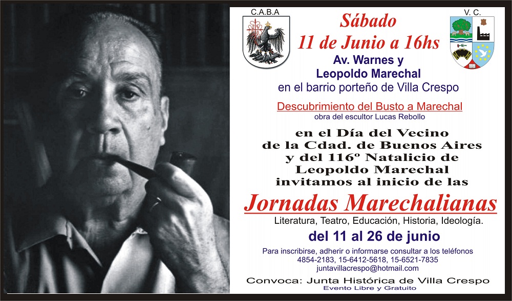 Sábado 11 de Junio. 116º Natalico de Leopoldo Marechal y Dia del Vecino de Buenos Aires en la BIBLIOTECA POPULAR ALBERDI a las 16 horas, Acevedo 666.
