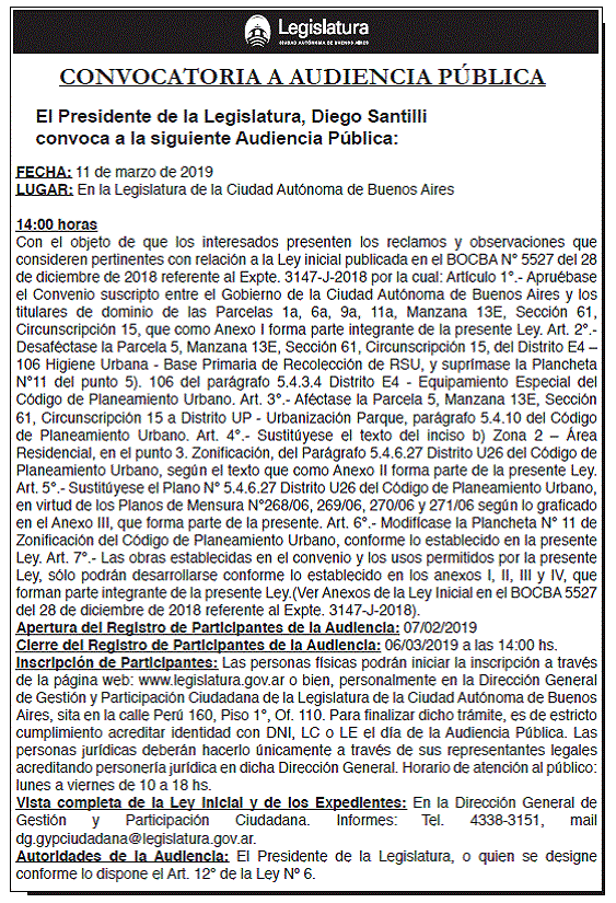 AUDIENCIA PÚBLICA 11 DE MARZO 2019 14 horas Planeamiento Urbano 23 de enero del 2019