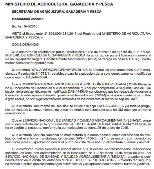 El ministerio de agricultura aprobó una nueva soja transgénica de la empresa Dow Chemical, la cual es tolerante a tres agroquímicos, uno de ellos el 2-4 D, que supo ser parte del Agente Naranja. Esta noticia es terrible para todos, principalmente para las 12 millones de personas que viven en las áreas rurales de nuestro país y siguen evidenciando con sus enfermedades lo desastroso que es este modelo tóxico. Por otro lado su sola aprobación debería ser una prueba de lo poco inteligente que es esta agricultura que desconoce las reglas básicas de la naturaleza.
